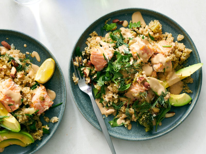 Salmon with quinoa and steamed vegetables. Baked or grilled salmon, quinoa, steamed broccoli, and carrots. Omega-3 from salmon helps hormones.